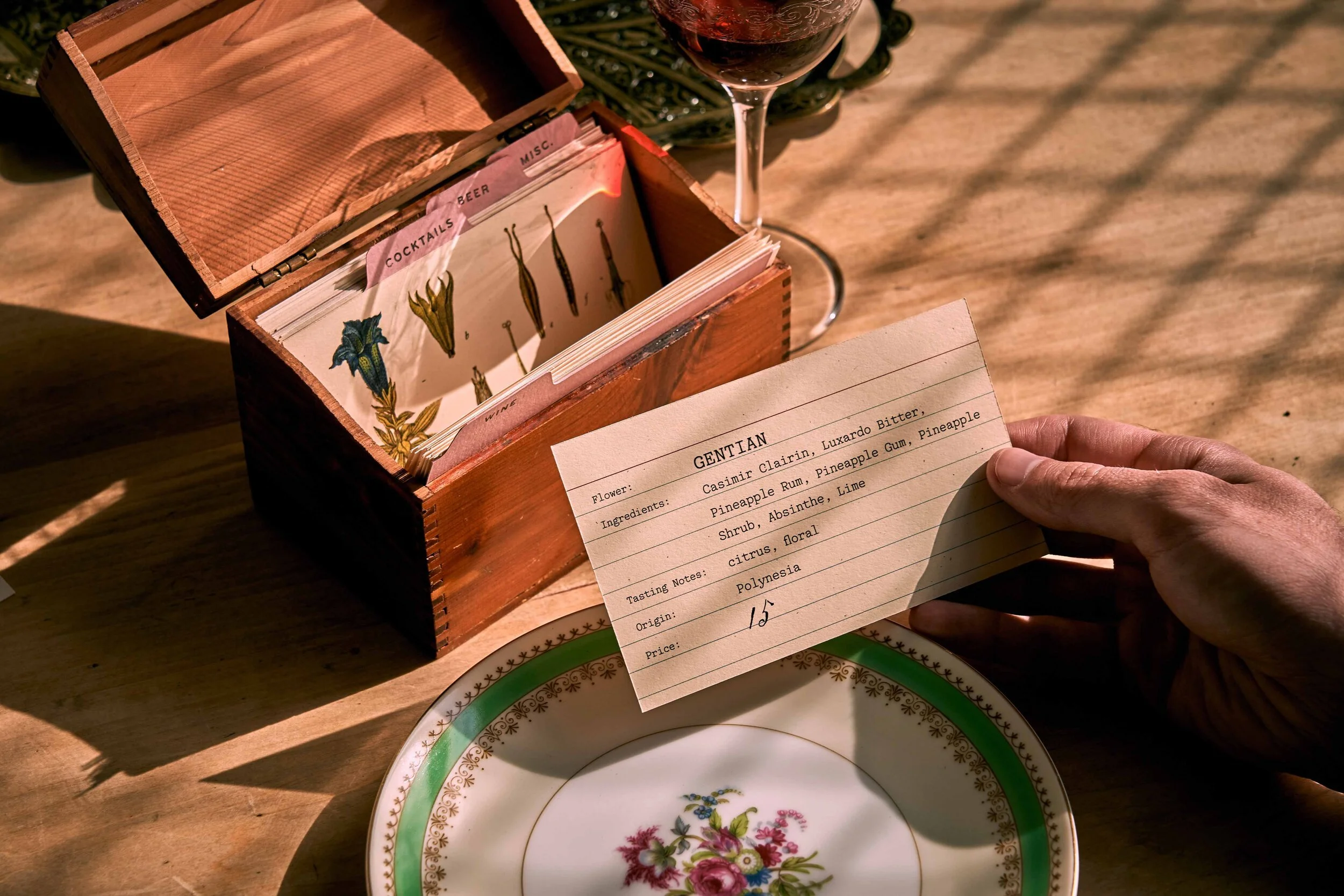 This narrative inspired various details in the restaurant, from a cocktail menu contained in a vintage box with various botanical index cards to backlit bookcases suggesting a studious world traveler with delicate feminine touches. We used multiple logo styles to suggest billheads from exotic places and designed a layered menu system reminiscent of a botanical research collection.