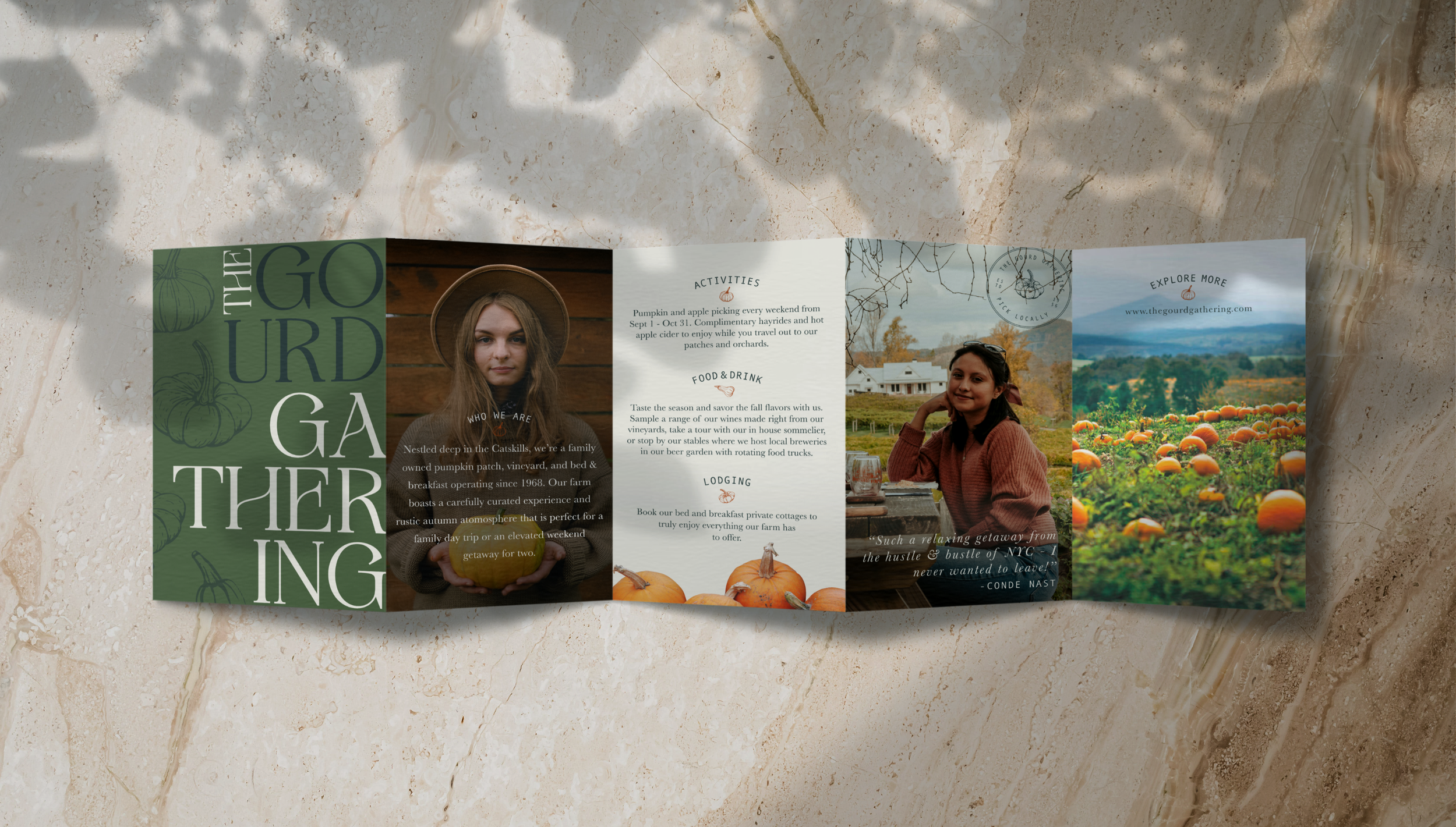 Nestled in the Catskill Mountains of New York, The Gourd Gathering has been reimagined not only as a scenic day trip destination, but also a cozy boutique bed & breakfast getaway with private cottages available for weekend bookings. I developed this brief to create a new brand for an already established orchard that would highlight the cottage amenities and not only entice but make it easy for guests to book a stay.