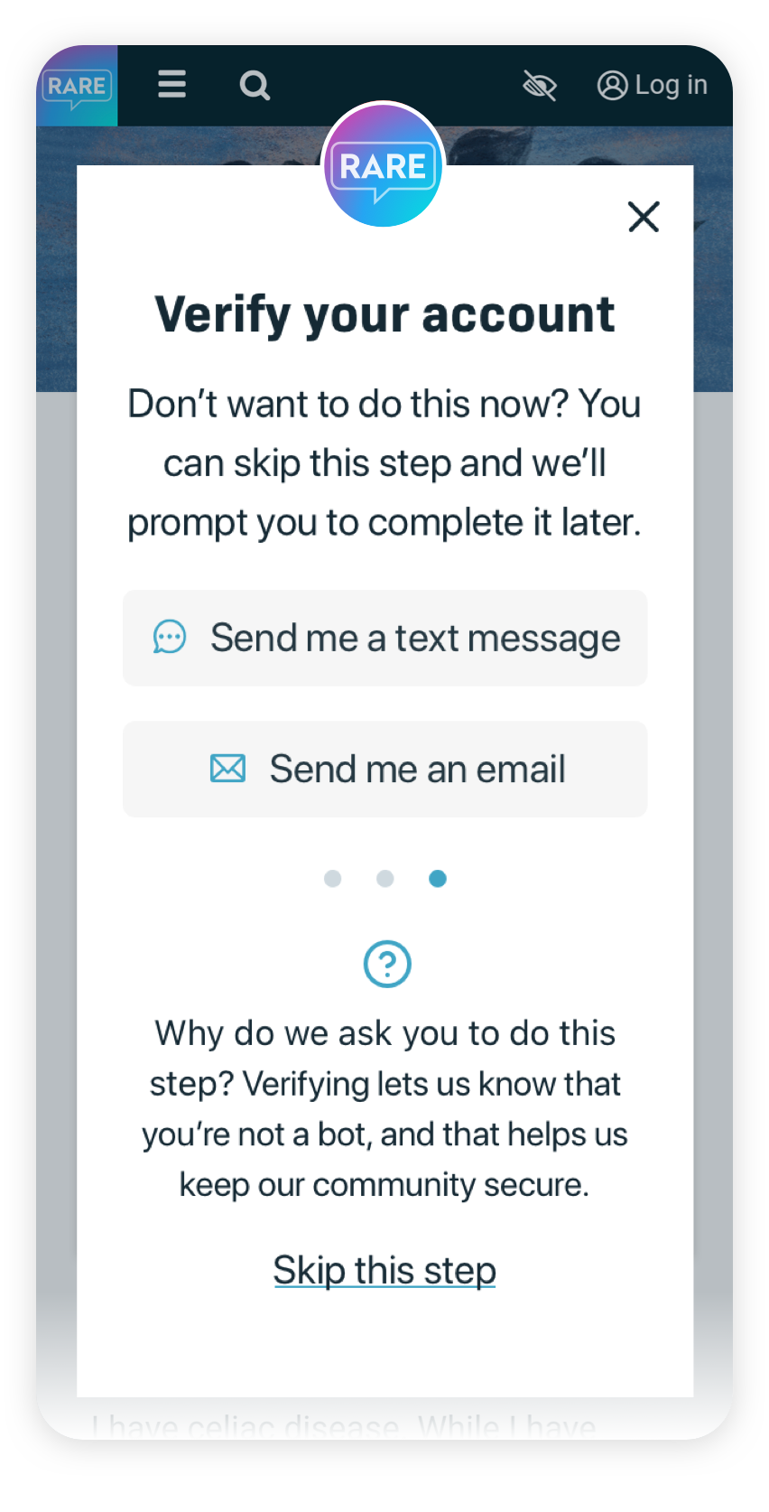 We also decided to add something small but mighty to the modal screens of some of our more nuanced communities that required more information from the user - three small dots underneath the Continue button to subtly let the user know how long the registration process would be. We hoped that this would decrease registration abandonment.